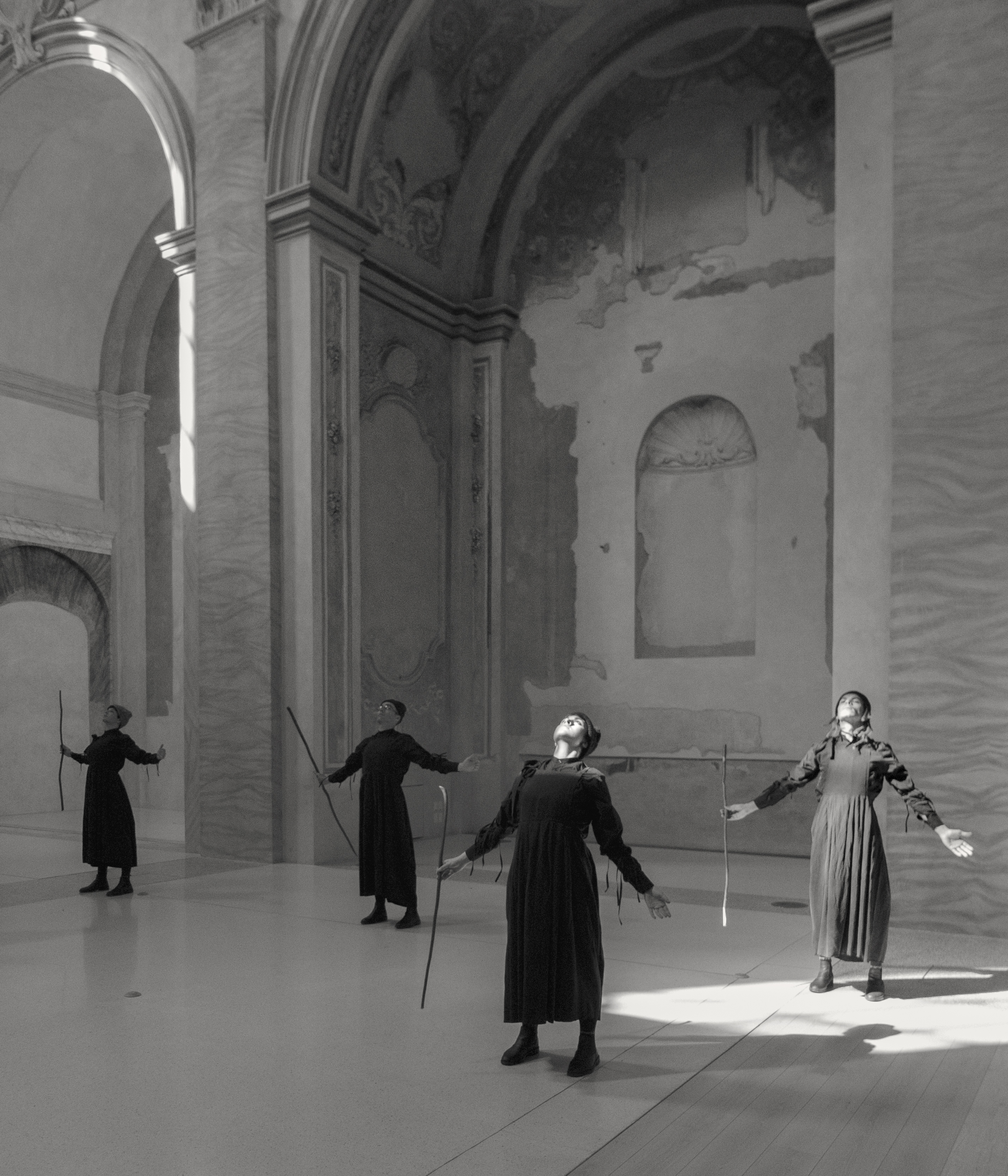 Le Esercitazioni Ritmiche di Mestre propongono uno studio che terminerà con la danza Il trattamento delle onde, basato sul suono delle campane. L’ascolto di questi antichi oggetti sonori rivela la parte negativa del suono; la loro eco si prolunga nel tempo e incontra, durante la sua dispersione, nuovi rintocchi. La sequenza dei battimenti che continuano a galleggiare nell’aria genera coincidenze aleatorie e ritmi, differenti e compresenti. La consistenza spettrale del suono fonda una capacità di ascolto che stringe insieme la presenza e la memoria (una presenza che non passa). I ‘trattamenti’, cui il titolo della danza fa riferimento, sono i colpi, i movimenti e le sospensioni che si effettuano con un bastoncello di nocciolo.