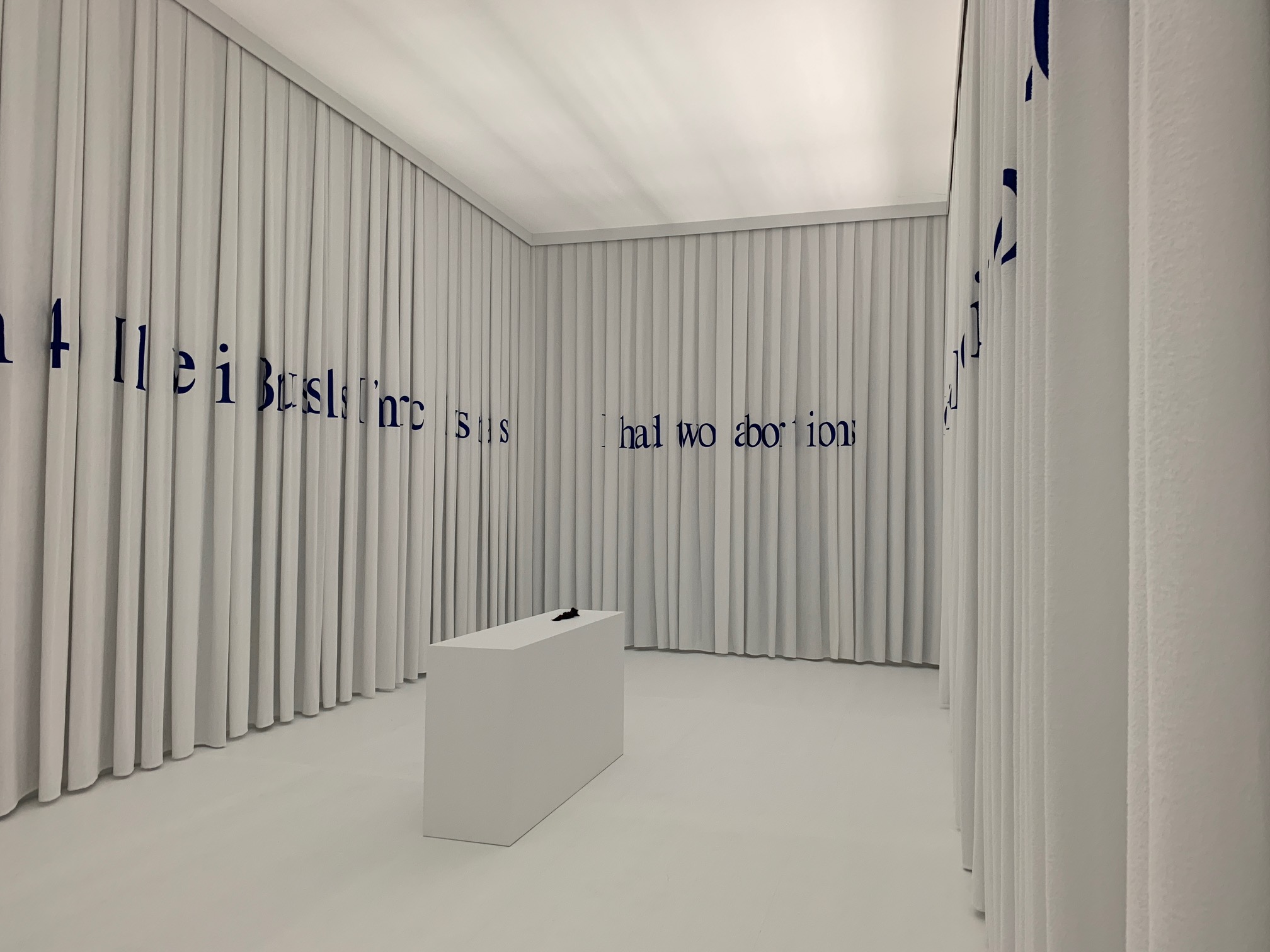 History of Oil Painting, titolo dell’opera presentata a Bozar, tradisce sin da subito un piano articolato di referenze alla storia dell’arte. Castellucci costruisce un vestibolo installativo, un nodo drammaturgico, che convoca in pieno la cultura barocca. Se la pittura barocca non smette mai di fare pieghe, l’artista fa della piega il centro della sua operazione: le pareti di un’intera stanza ricavata in un ambiente del museo sono perimetrate da un tendaggio di spugna bianca, ordinatamente organizzato piega su piega, piega secondo piega.