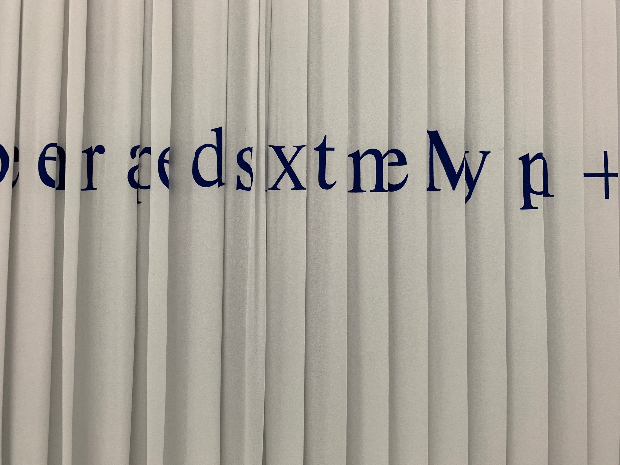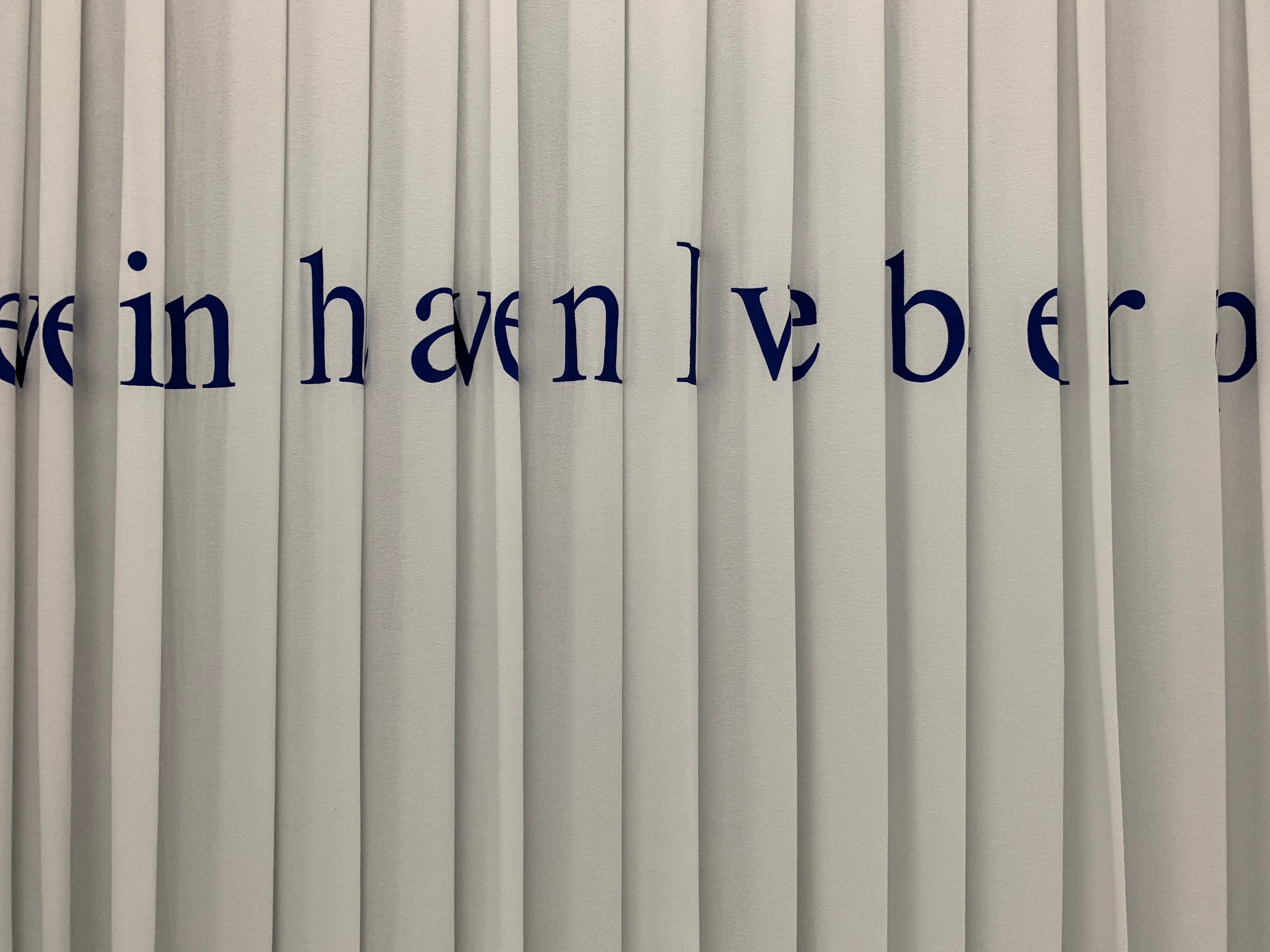 In questo trionfo di pieghe, in cui d’un tratto pare serpeggiare per associazione tutto un mondo di etere, sacre prostitute del tempio o di Maddalene, il vero cortocircuito tra i capelli e l’ambiente si compie attraverso la tecnica del ricamo. Nella spugna è ricamato a lettere cubitali il condensato della vita di questa donna-modella. La frase si spazia e si nasconde nel continuo riprodursi della piega. Nel suo risvolto si cela letteralmente la trama di un discorso e lo si lascia etimologicamente interdetto. Questa negazione sembra dire che non c’è accesso a una realtà spiegabile, perché è piegata in infinite pieghe. Non c’è accesso perché è impossibile spiegare (nel senso di togliere la piega) la vita, perché irriducibile al linguaggio. L’inflazione assegnata all’elemento linguistico, scarica il logos a vantaggio del soma e alla potenza flagrante della sua oggettività.
